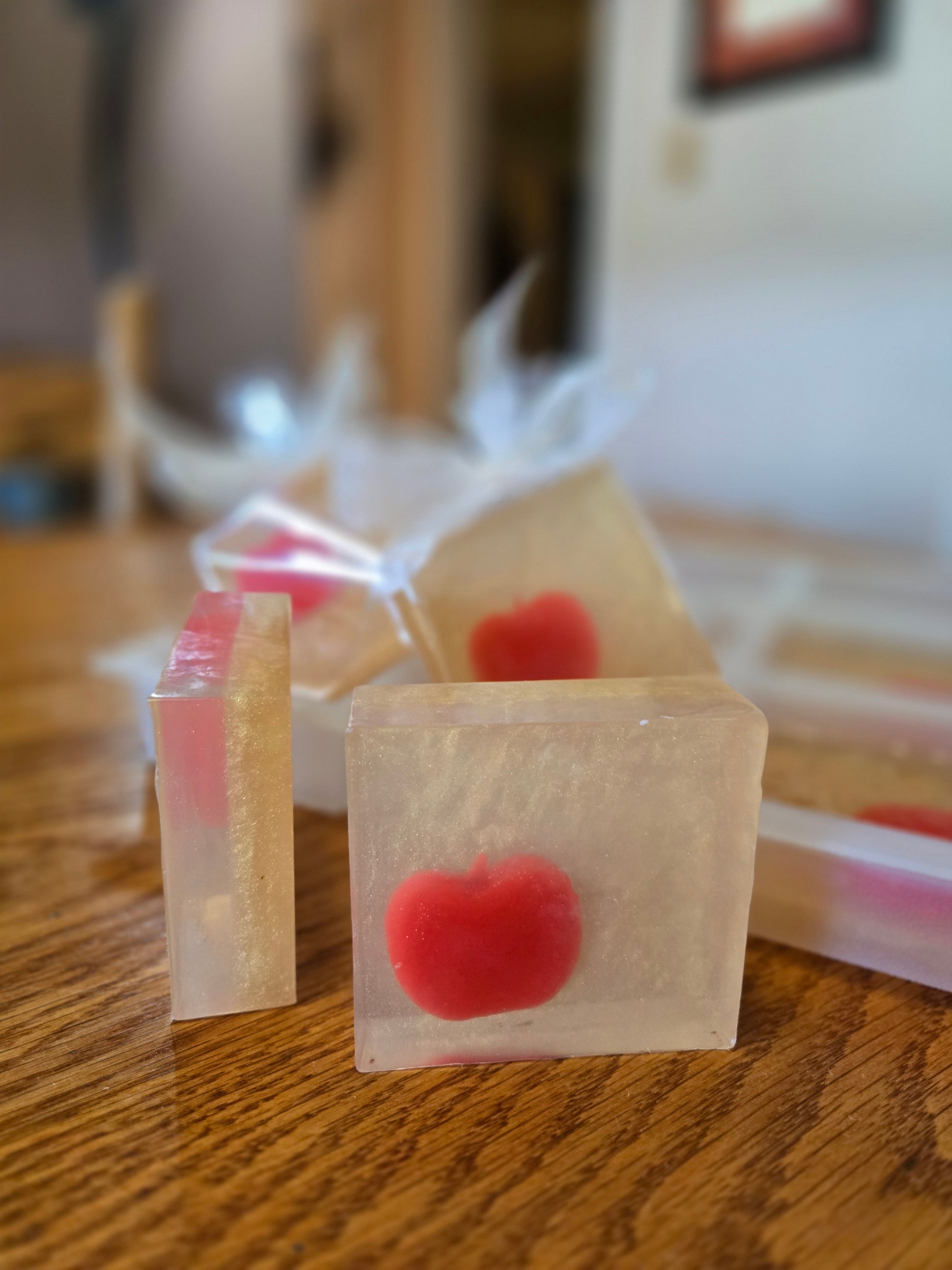 Approx 3.5 oz bar of layered / embedded honey soap scented with Red Apple fragrance oil.